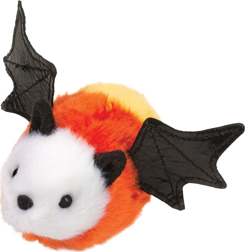 Douglas Toys' mini Candy Corn Bat stuffed animal is flying in to wish everyone a fun and exciting Halloween! He's sure to catch your eye with his colorful yellow, orange, and white design fashioned after the classic Halloween candy. A pair of leatherette wings with stitched details accents his look, while shiny, dark eyes and a flocked nose complete his endearing appearance. Crafted in soft plush materials and filled with resilient polyester fill, this tiny Halloween friend is soft and lovable. Bring home just one or gather a flock of them to celebrate the spooky season. A small loop on his back allows for hanging, making this plush Candy Corn Bat an easy and whimsical addition to your autumnal décor!