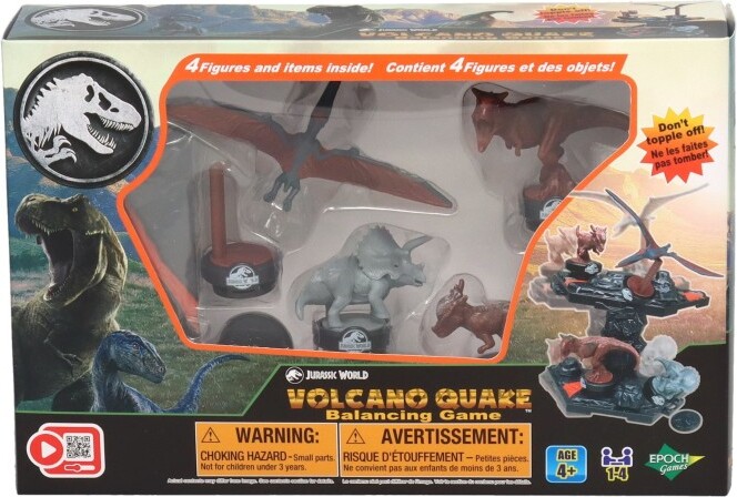 Unique balancing game with Jurassic World dinosaurs. Volcano stage shakes and dinosaurs slide as you place and remove figures based on the number you roll on the die. Be careful they don't topple off the volcano! Includes volcano stage with 4 collectible dinosaur figures and die.