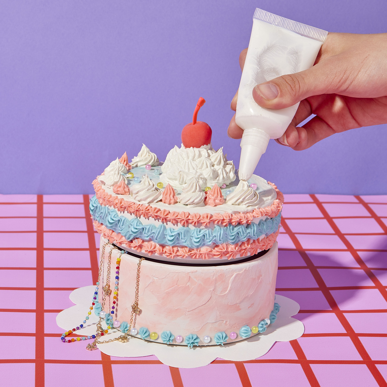 Create a cake-like ceramic jewelry box with whipped icing clay, sprinkles and clay cherry! Special nozzles let you "frost" with air-dry clay, and the icing tool lets you make patterns as you spread the clay. 3 tubes of whipped icing clay, red air dry clay and colorful pearl "sprinkles" make your creation trendy and super-customizable. Punch out the doily from the package and add felt interior for that final polish. Adorn the cutest cake box ever!