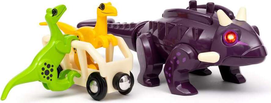 Smash through any obstacle with the 36082 Dinosaur Attack Set. Designed to fit perfectly over BRIO wooden tracks, this mighty dino comes alive with red light-up eyes and motion-activated roaring. With its spring-loaded tail ready to swing, your child can use the Ankylosaur to knock away the two colourful velociraptor figures included in this playset. A magnet hidden in its tail lets you pull wagons, just like a BRIO train. Part of the BRIO World Dinosaur range, it's a must-have for kids who love dinosaurs and trains.