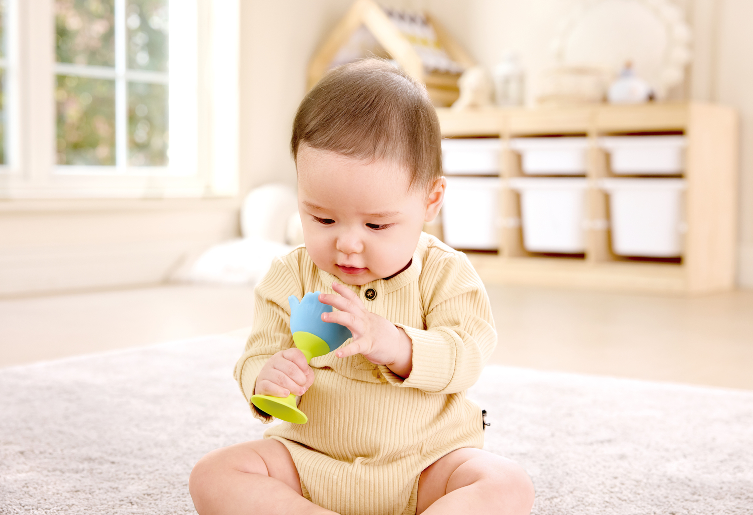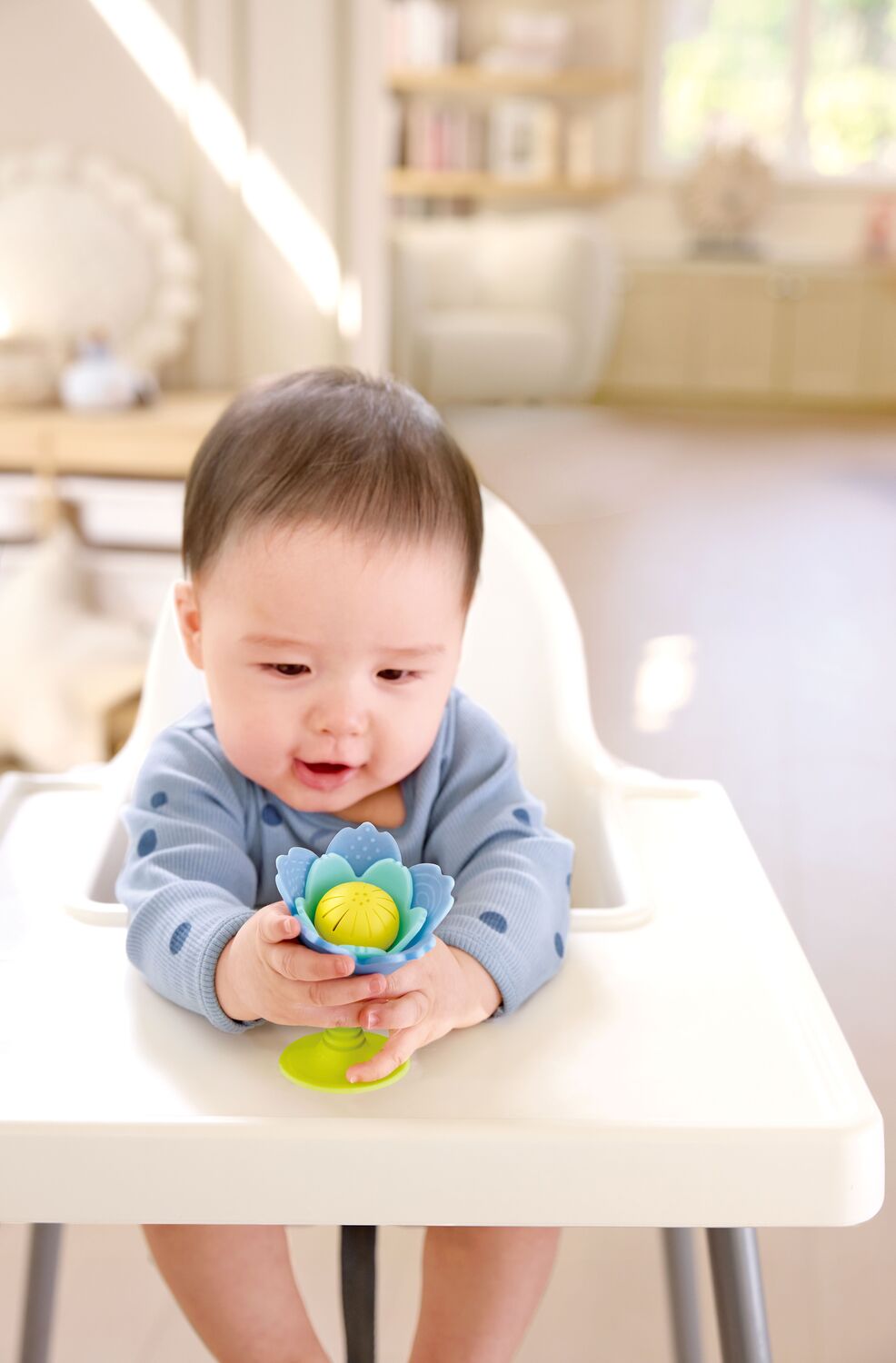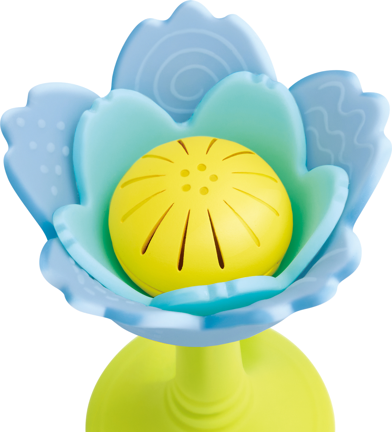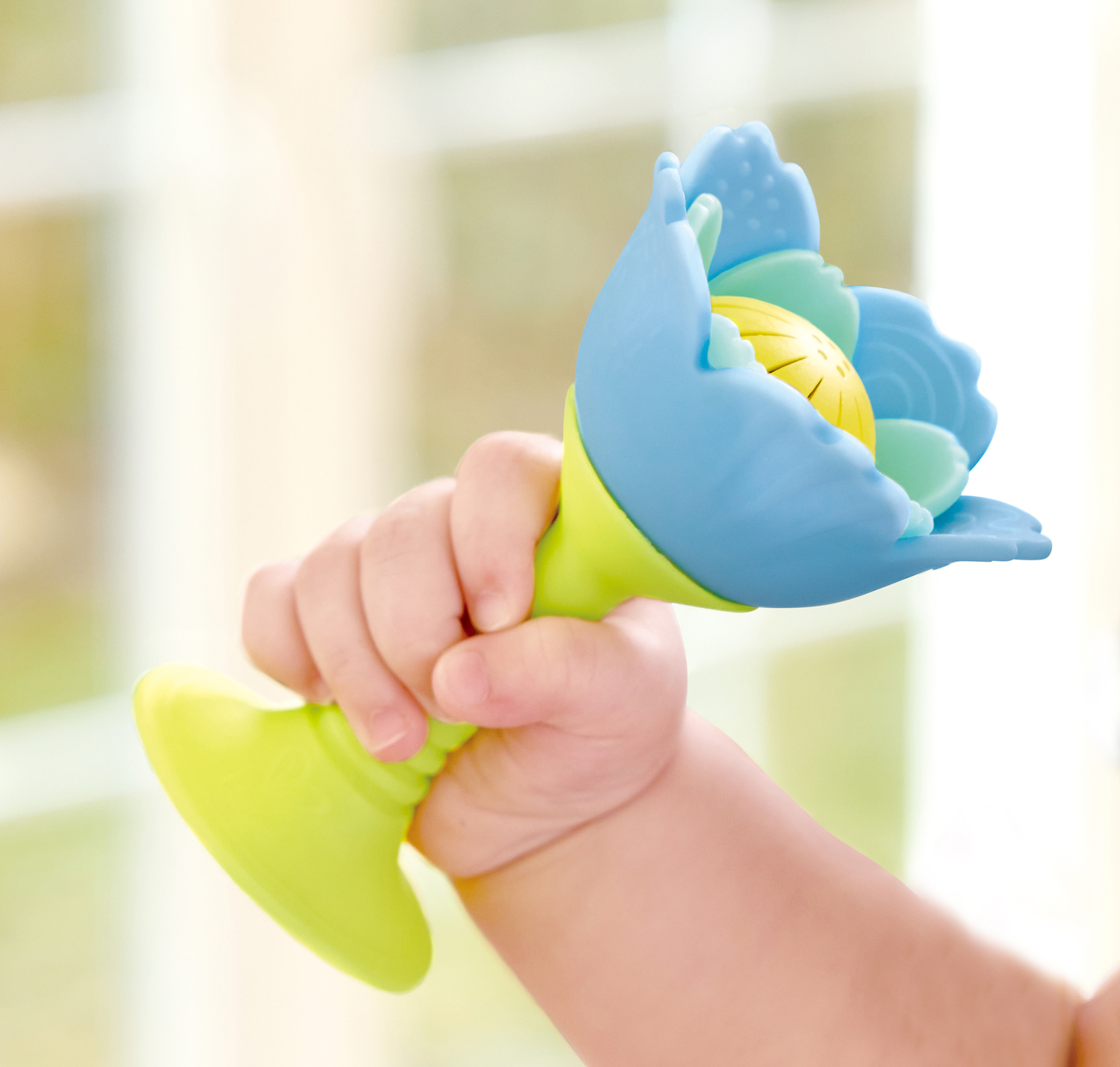 - Attach the flower to a smooth surface using its suction base - babies will love the tactile sensation of the chewable petals and the lively rattle sound that comes from shaking it.