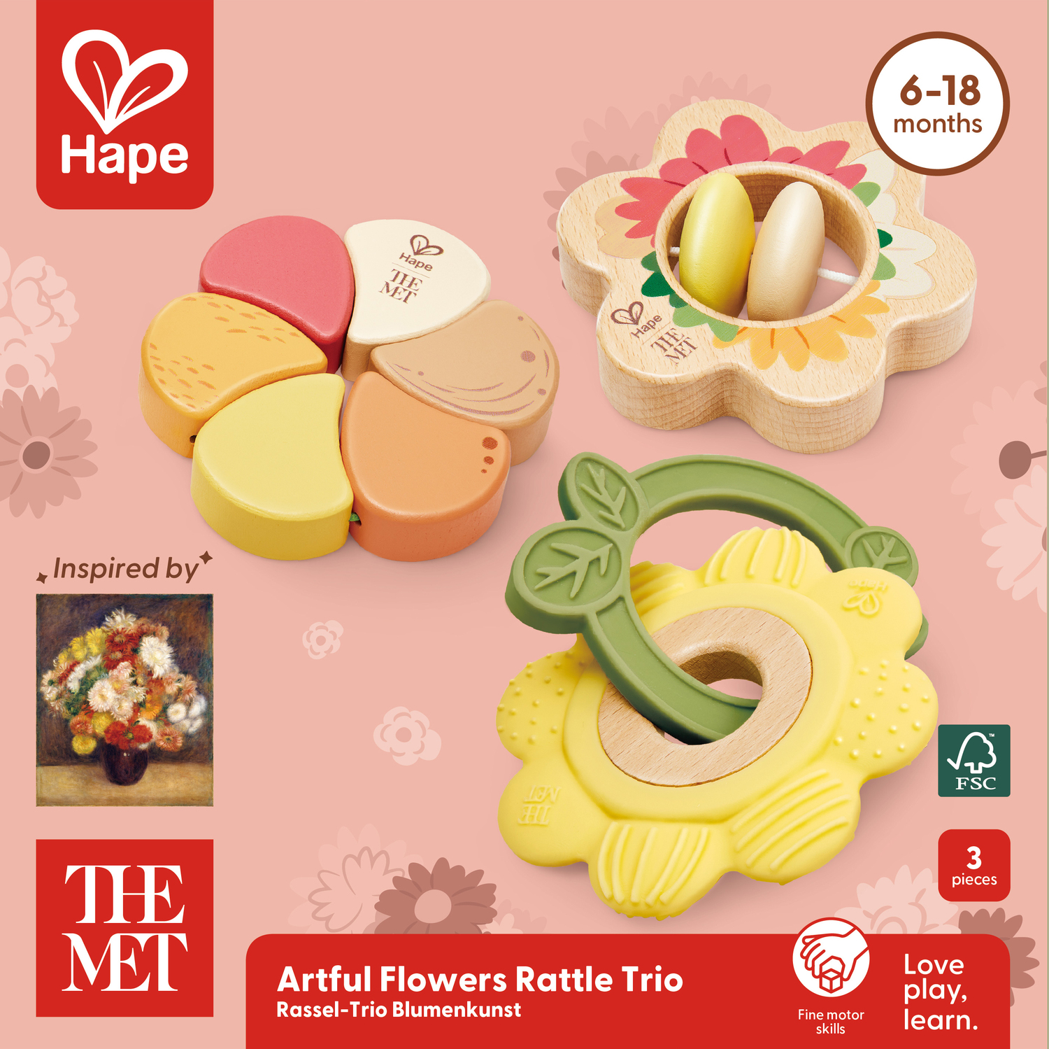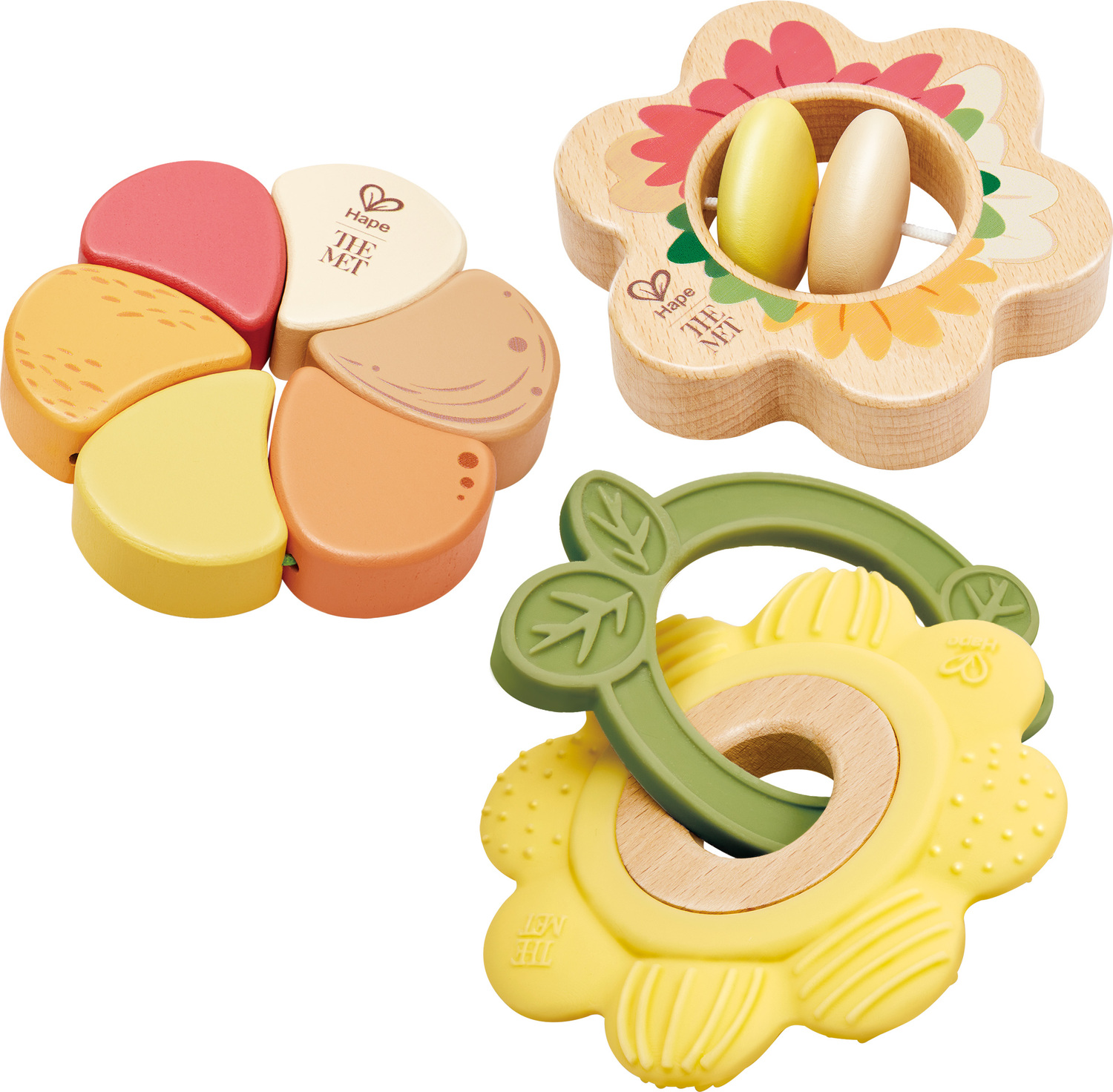 Bring the joy of art into your baby's hands with the Hape x The Met Flower Rattle Set, a beautifully crafted collection of sensory toys inspired by Renoir's Bouquet of Chrysanthemums (1881) from The Metropolitan Museum of Art. Designed for ages 6 to 18 months, this set introduces babies to color, texture, sound, and motion—all while celebrating the work of a renowned artist.