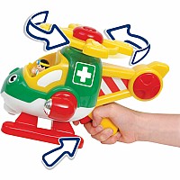 Press Harry Copter's trigger to start his helicopter rotor blades turning. When he's airborne, use his magnetic lift to pick up the injured animals. Twist his searchlight to release them once they have been returned to safety. All in a good day's work!